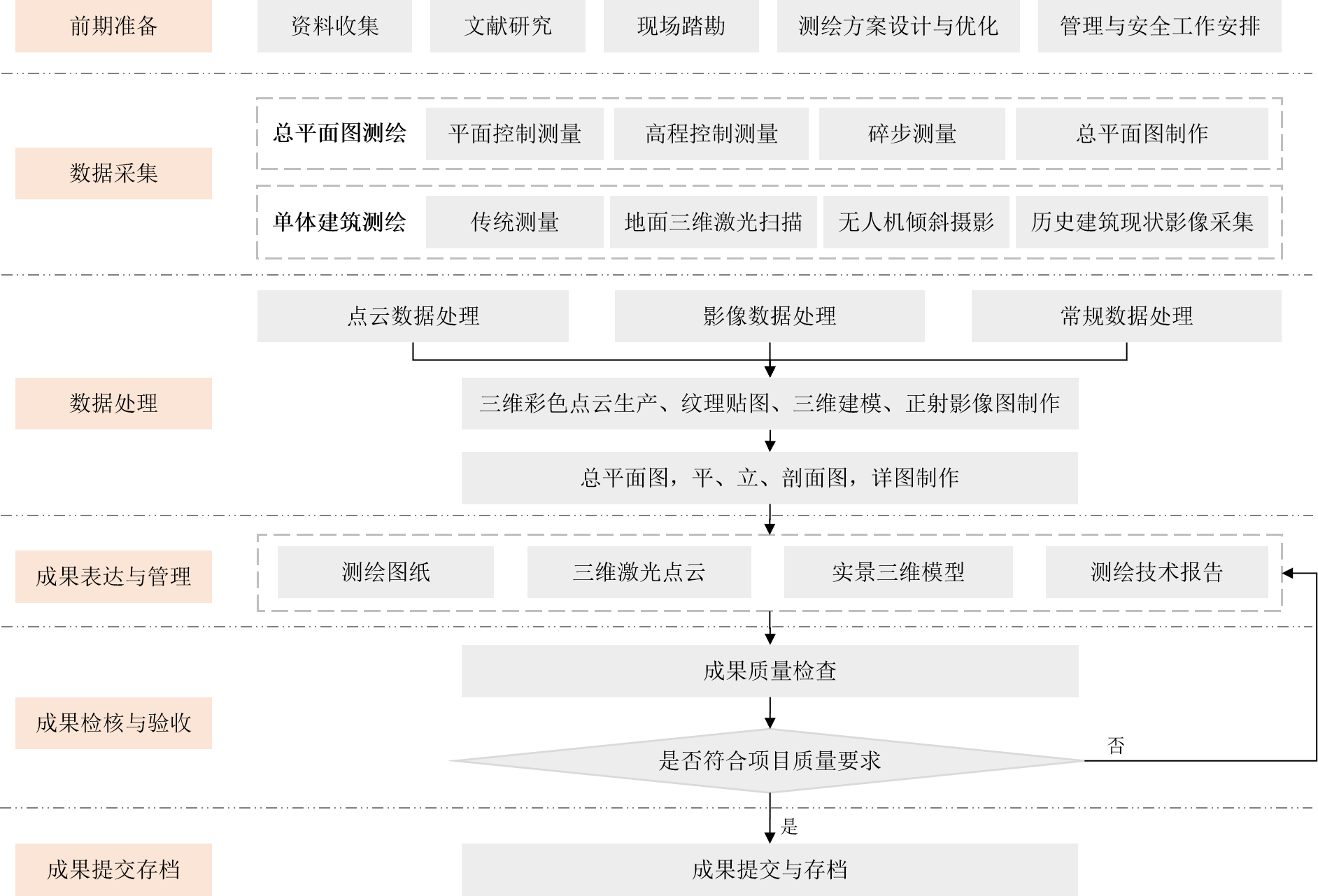 歷史建筑測(cè)繪的工作流程分為前期準(zhǔn)備、數(shù)據(jù)采集、數(shù)據(jù)處理、成果表達(dá)與管理、成果檢核與驗(yàn)收、成果提交存檔等五個(gè)階段。