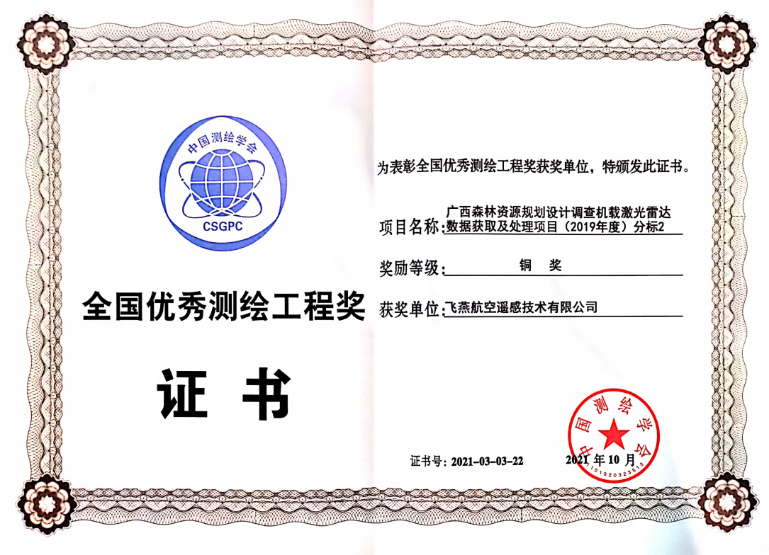 森林是人類的搖籃,發(fā)達的林業(yè)是國家富裕、社會文明的重要標(biāo)志。飛燕遙感承接的“廣西森林資源規(guī)劃設(shè)計調(diào)查機載激光雷達數(shù)據(jù)獲取及處理項目(2019年度)分標(biāo)2”助力廣西林業(yè)分析,摸清“家底”,榮獲2021年度全國優(yōu)秀測繪工程獎銅獎。