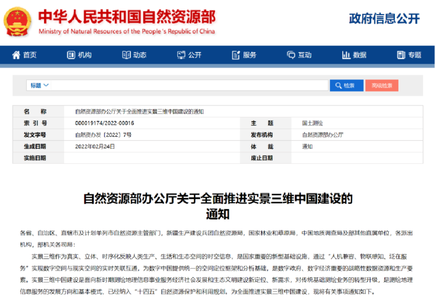 2022年2月24日,自然資源部辦公廳印發(fā)了《關于全面推進實景三維中國建設的通知》?!锻ㄖ分赋?,實景三維作為真實、立體、時序化反映人類生產、生活和生態(tài)空間的時空信息,是國家重要的新型基礎設施,是數(shù)字政府、數(shù)字經濟重要的戰(zhàn)略性數(shù)據資源和生產要素。實景三維中國建設是面向新時期測繪地理信息事業(yè)服務經濟社會發(fā)展和生態(tài)文明建設新定位、新需求,對傳統(tǒng)基礎測繪業(yè)務的轉型升級,是測繪地理信息服務的發(fā)展方向和基本模式,已經納入“十四五”自然資源保護和利用規(guī)劃。