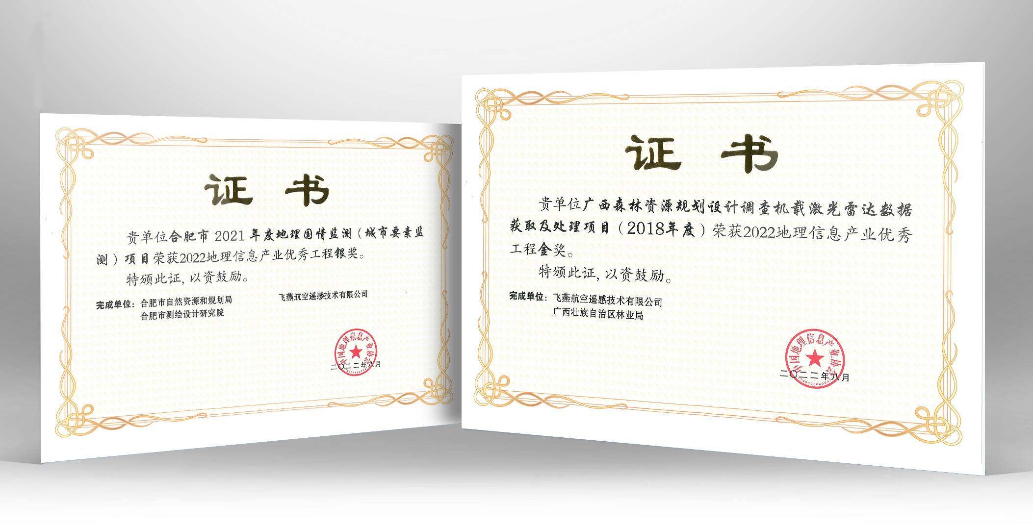 飛燕遙感憑借“廣西森林資源規(guī)劃設(shè)計調(diào)查機(jī)載激光雷達(dá)數(shù)據(jù)處理”和“合肥市地理國情監(jiān)測”項目分別榮獲2022年地理信息產(chǎn)業(yè)優(yōu)秀工程獎金獎和銀獎。
