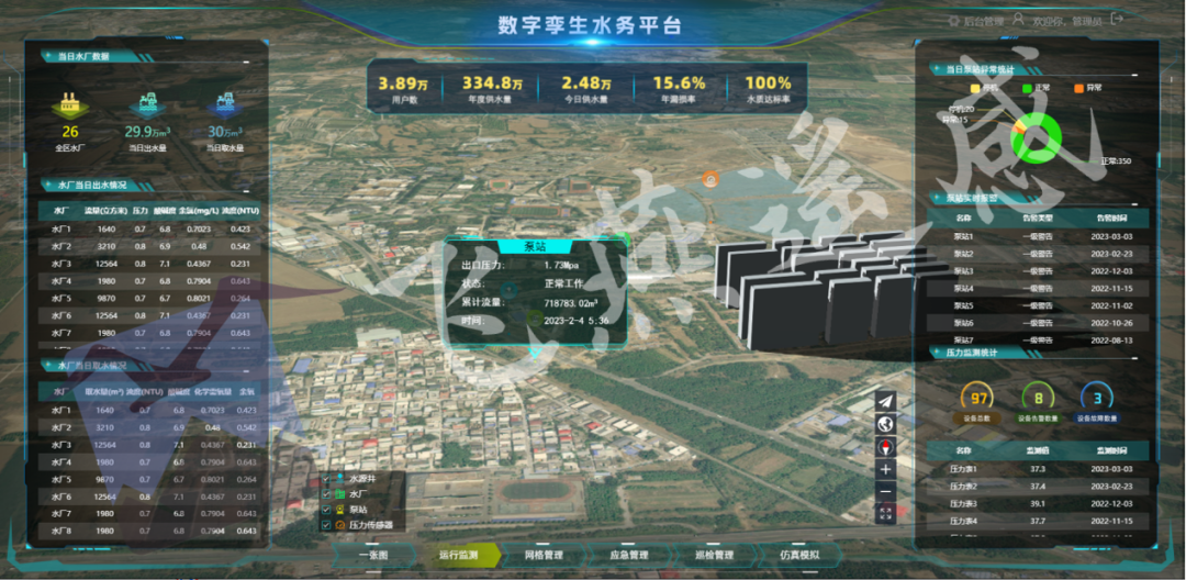 集成數(shù)字孿生技術(shù)、三維可視化技術(shù),通過建模渲染建立水務(wù)設(shè)施的結(jié)構(gòu)形狀和位置關(guān)系,實現(xiàn)物理對象的數(shù)字化表達。打通水務(wù)管理中各業(yè)務(wù)系統(tǒng)的數(shù)據(jù)孤島,實現(xiàn)水務(wù)工程的三維展示、全過程實時監(jiān)測、故障預(yù)警等,協(xié)助管理者一目了然地掌握業(yè)務(wù)趨勢,獲取數(shù)據(jù)使用價值,完成高效率管理、運營和決策。