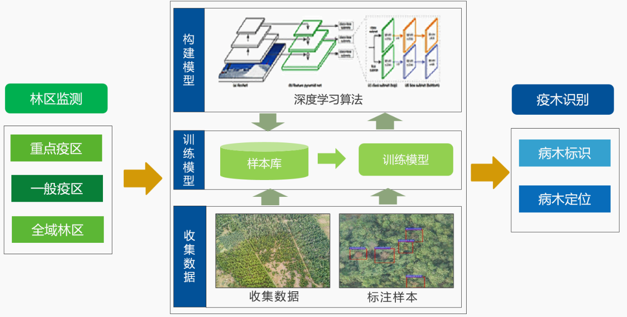 利用無(wú)人機(jī)、大飛機(jī)等監(jiān)測(cè)平臺(tái)采集林區(qū)數(shù)據(jù),依托自主研發(fā)識(shí)別AI算法,構(gòu)建人工智能數(shù)據(jù)樣本庫(kù),覆蓋多時(shí)期、多樹種多脅迫等樣本數(shù)據(jù),以支撐高性能算法模型的訓(xùn)練和識(shí)別。