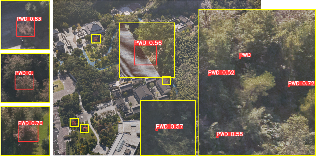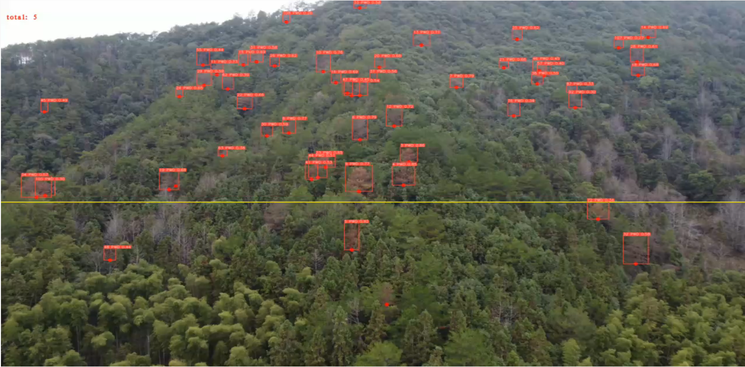 松材線蟲病死樹出現(xiàn)的高峰期在每年的8—10月份,一株松樹感染松材線蟲病最快40天左右就會(huì)死亡。飛燕遙感AI智能識(shí)別方案具有監(jiān)測(cè)速度快、識(shí)別準(zhǔn)確率高、實(shí)施成本低的特點(diǎn),能夠及時(shí)發(fā)現(xiàn)松樹異常情況,確保疫情早發(fā)現(xiàn)、早除治。