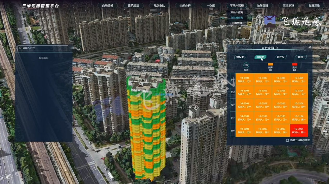 基于城市實(shí)景三維模型和相關(guān)國(guó)土信息數(shù)據(jù),提供二三維數(shù)據(jù)一體化展示、國(guó)土資源一張圖管理功能,支持三維宗地、三維樓幢、三維戶室的多層級(jí)精細(xì)化地籍管理。