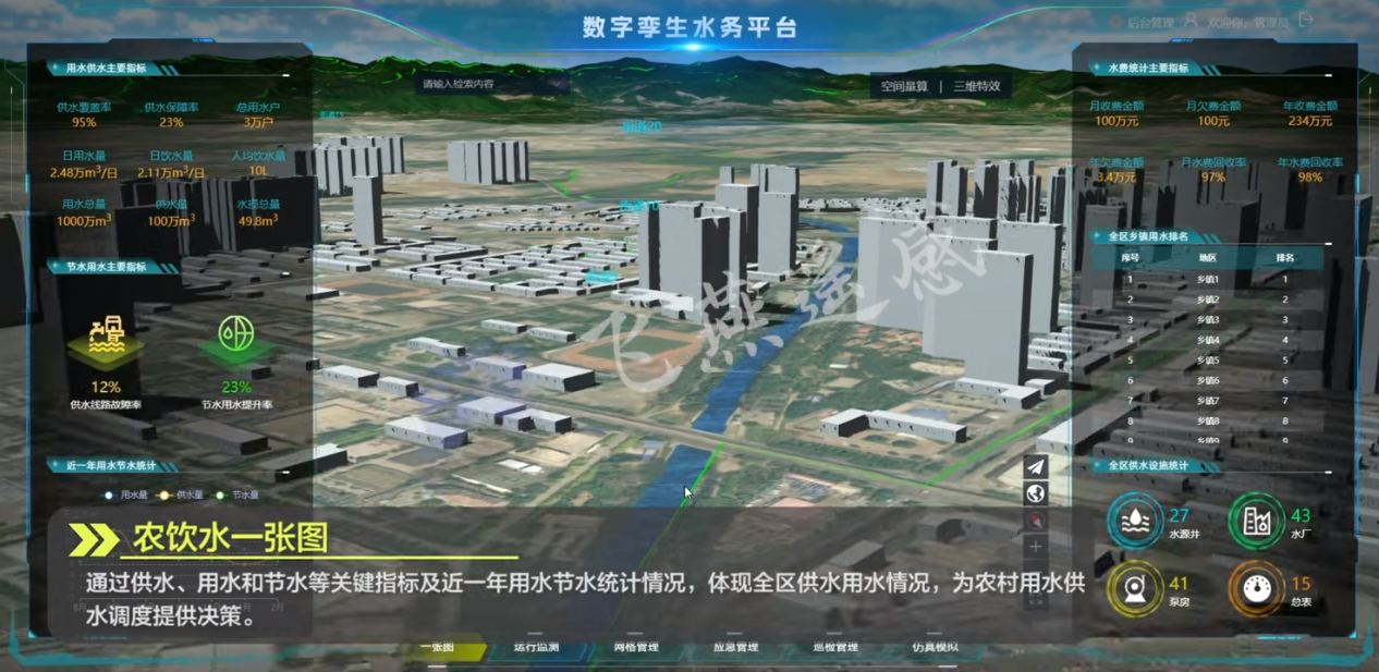 集成數(shù)字孿生技術(shù)、三維可視化技術(shù),通過(guò)建模渲染建立水務(wù)設(shè)施的結(jié)構(gòu)形狀和位置關(guān)系,實(shí)現(xiàn)物理對(duì)象的數(shù)字化表達(dá)。打通水務(wù)管理中各業(yè)務(wù)系統(tǒng)的數(shù)據(jù)孤島,實(shí)現(xiàn)水務(wù)工程的三維展示、全過(guò)程實(shí)時(shí)監(jiān)測(cè)、故障預(yù)警等,協(xié)助管理者一目了然地掌握業(yè)務(wù)趨勢(shì),獲取數(shù)據(jù)使用價(jià)值,完成高效率管理、運(yùn)營(yíng)和決策。