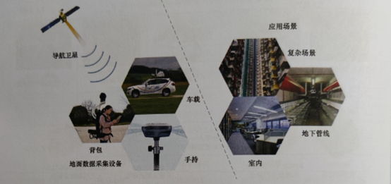 針對城市中復雜場景、室內(nèi)、地下管線等衛(wèi)星遙感以及航空攝影手段難以獲取數(shù)控的對象,可在地面進行數(shù)據(jù)采集,如圖 2-2 所示。實景三維地面數(shù)據(jù)采集主要有車載背包、手持等方式,通過將激光掃描儀、影像采集設(shè)備、定位定姿設(shè)備、同步控制器等多傳感器集成于一體,并根據(jù)采集需求將設(shè)備搭載在測量車上,對建筑、道路進行高精度實景三維數(shù)據(jù)采集,或通過背包、手持的方式對室內(nèi)室外、地下管線進行數(shù)據(jù)采集。