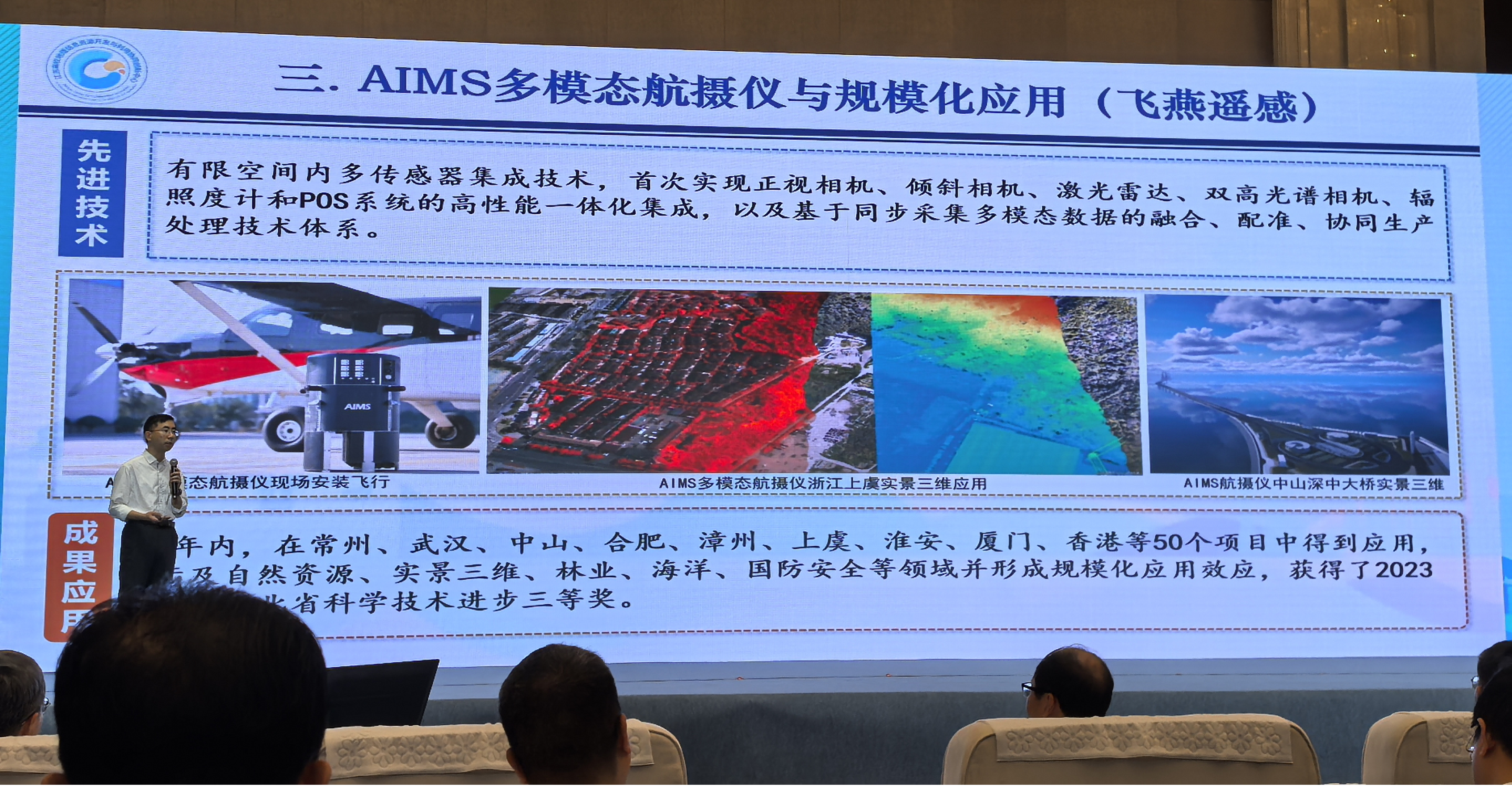 會上,多項地理信息協同創(chuàng)新代表性成果集中發(fā)布,省地理信息產業(yè)研究院副院長周良辰上臺發(fā)布最新成果。其中,飛燕遙感的AIMS多模態(tài)航攝儀的研制與規(guī)模化應用關鍵技術把數據要素作為贏在未來的革新力量。能夠一次性獲取多模異構、時相統一的航空遙感數據,實現地物全要素精細感知優(yōu)勢。利用多模態(tài)數據協同提升處理、解譯和應用的自動化、智能化水平,形成特征豐富、關聯性強的系列數據產品,助力實景三維建設。