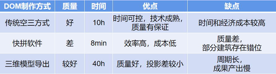 從三種方式制作的正射影像可以看出,質(zhì)量方面?zhèn)鹘y(tǒng)空三方式制作的正射影像和通過三維模型導(dǎo)出的正射影像精度較好,快拼影像質(zhì)量要差一些,尤其是高層建筑投影差明顯,甚至?xí)霈F(xiàn)錯(cuò)位現(xiàn)象。三種方式制作正射影像的優(yōu)缺點(diǎn)如表所示。