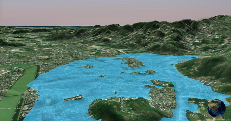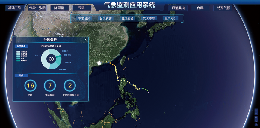 通過(guò)三維GIS技術(shù),結(jié)合氣象部門(mén)發(fā)布的氣象數(shù)據(jù)、現(xiàn)有的區(qū)域內(nèi)地形、河網(wǎng)等水文信息,構(gòu)建水利氣象監(jiān)測(cè)系統(tǒng)?;跉庀笠蛩貏?dòng)態(tài)分析,科學(xué)預(yù)測(cè)區(qū)域內(nèi)水域、水利造成的影響范圍及影響程度。針對(duì)極端天氣,例如臺(tái)風(fēng),系統(tǒng)會(huì)錄入臺(tái)風(fēng)的運(yùn)動(dòng)軌跡與時(shí)間信息,預(yù)測(cè)臺(tái)風(fēng)登陸的時(shí)間地點(diǎn),適時(shí)發(fā)出預(yù)警信息。